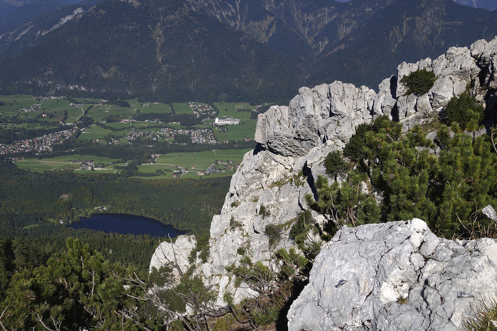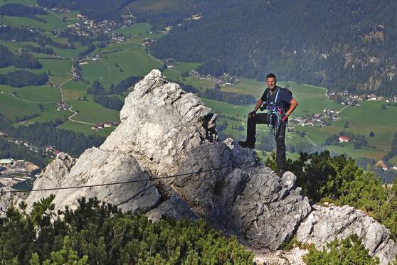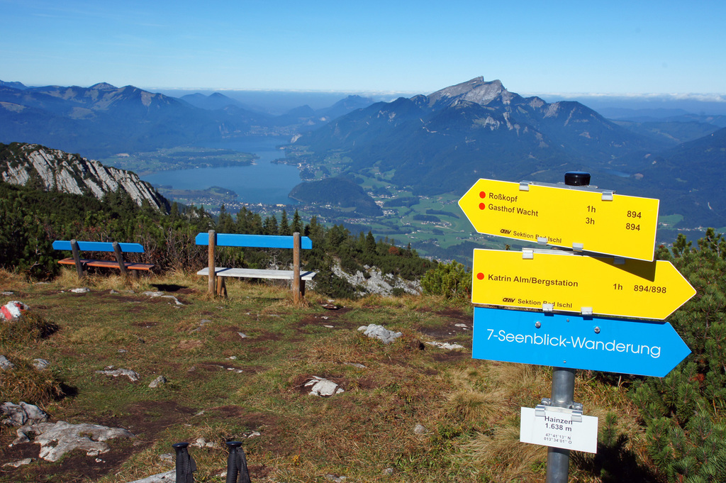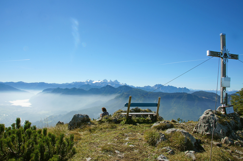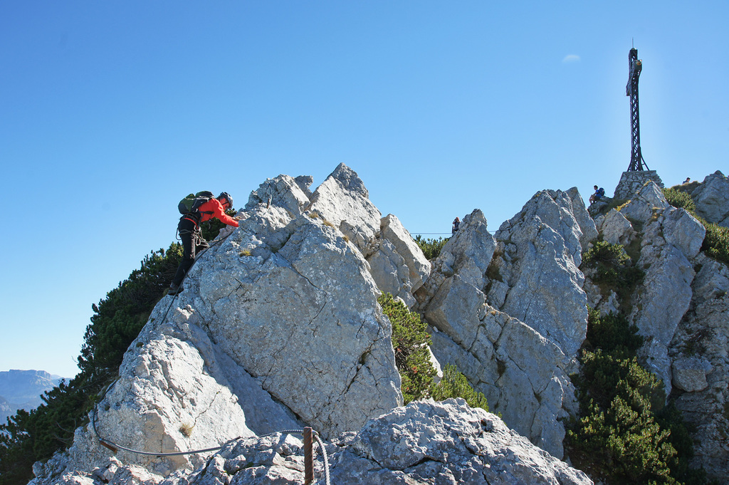 - Der 300 m lange Steig zum Kaiser-Franz-Josef-Gipfelkreuz verläuft immer recht luftig über die Kante der steilen Nordabbrüche und ist dabei jedoch nie richtig schwierig. Die Tour ließ es bei traumhafter Aussicht zu, zu Fotografieren, den Abstieg zu genießen und den Blick auf die umliegenden Seen zu richten: Traunsee, Wolfgangsee, Nussensee, Schwarzensee und Fuschlsee; sowie beim Ausstieg und Abstieg den Hallstättersee und den Mondsee.