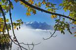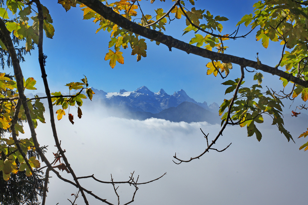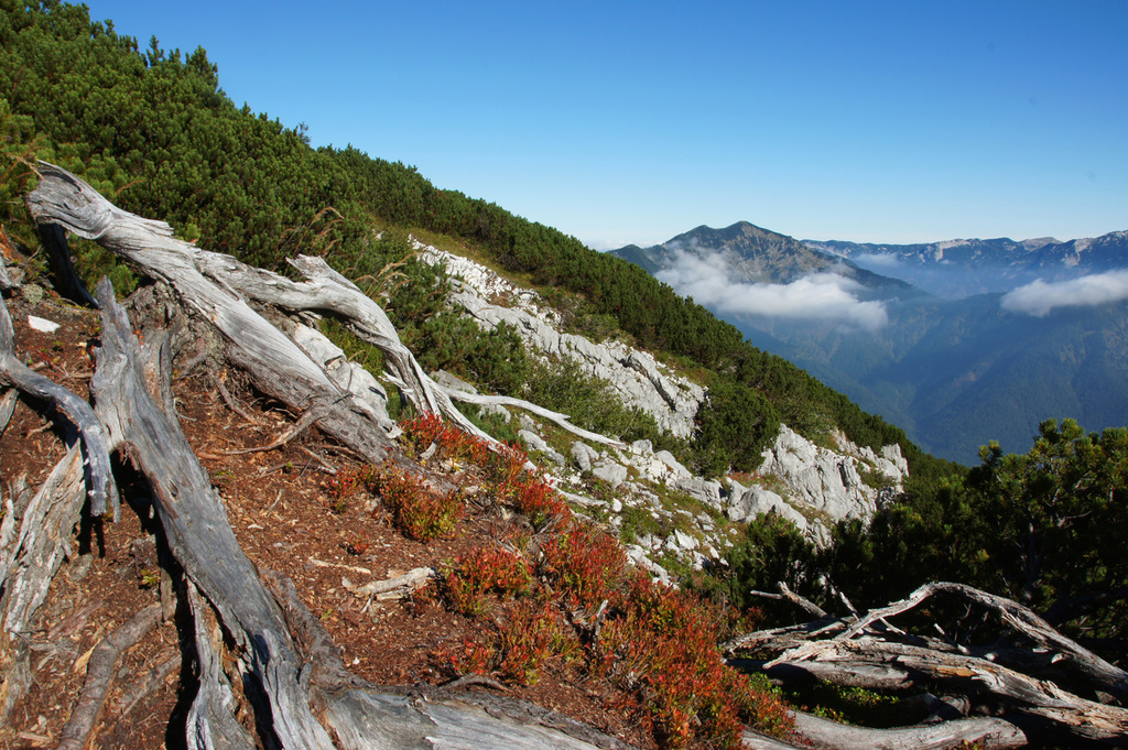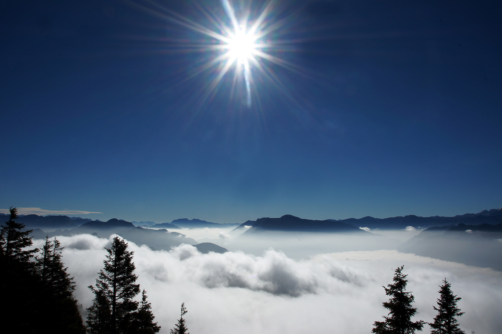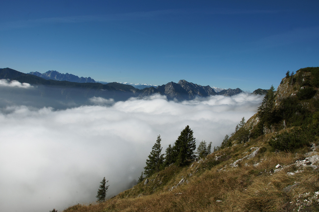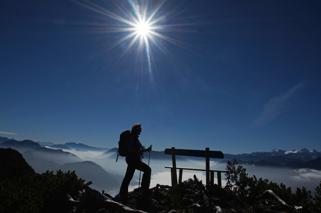 - Der 300 m lange Steig zum Kaiser-Franz-Josef-Gipfelkreuz verläuft immer recht luftig über die Kante der steilen Nordabbrüche und ist dabei jedoch nie richtig schwierig. Die Tour ließ es bei traumhafter Aussicht zu, zu Fotografieren, den Abstieg zu genießen und den Blick auf die umliegenden Seen zu richten: Traunsee, Wolfgangsee, Nussensee, Schwarzensee und Fuschlsee; sowie beim Ausstieg und Abstieg den Hallstättersee und den Mondsee.