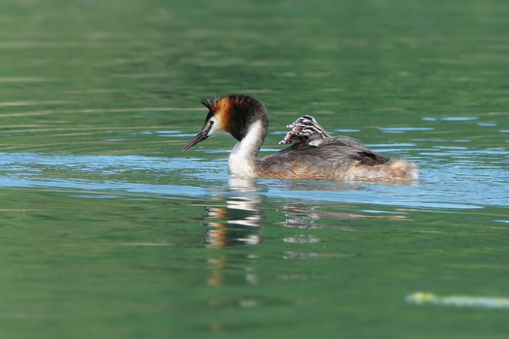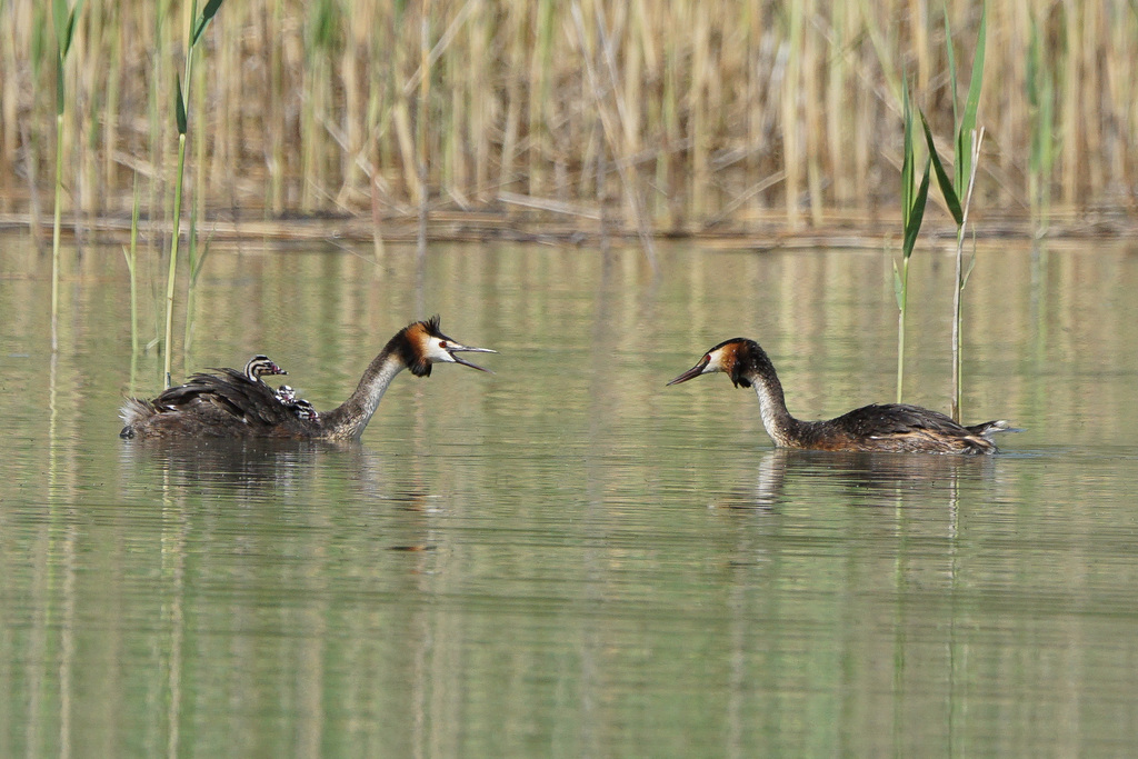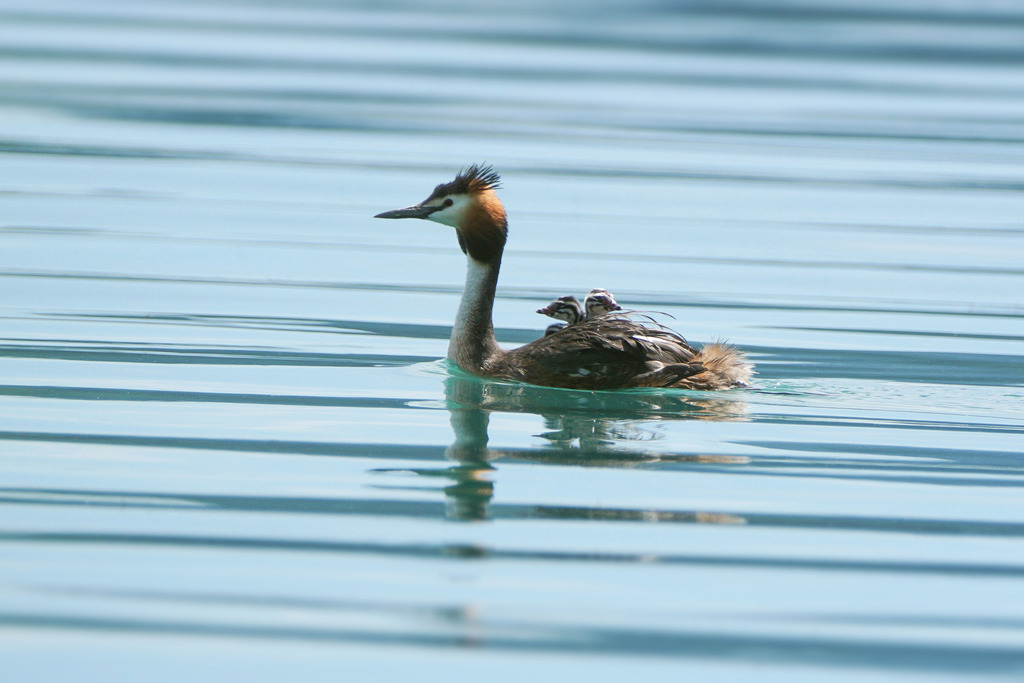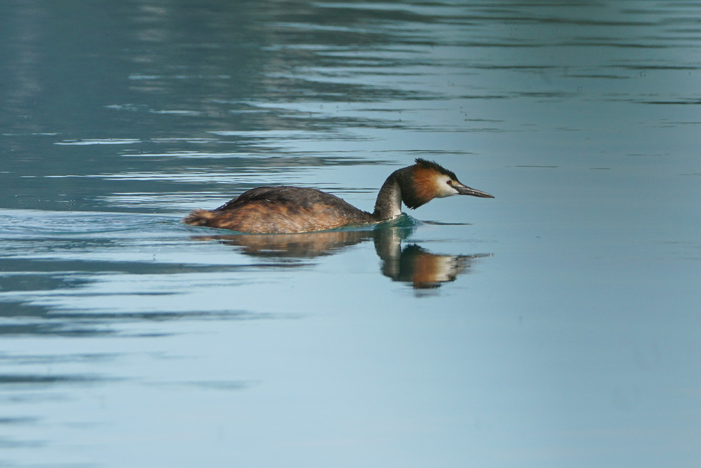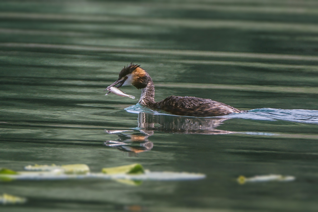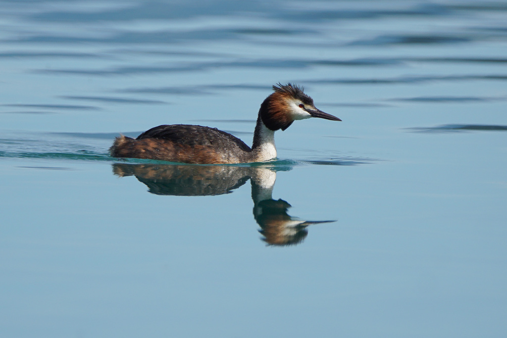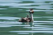 Die Haubentaucherweibchen und Männchen sind so schön anzuschauen in ihrem Prachtkleid und Schlichtkleid. Sie schwimmen häufig mitten auf Seen und verschwinden immer wieder für kurz dauernde aber bis zu 5 bis 20 Meter tiefe Tauchgänge.