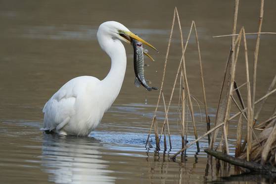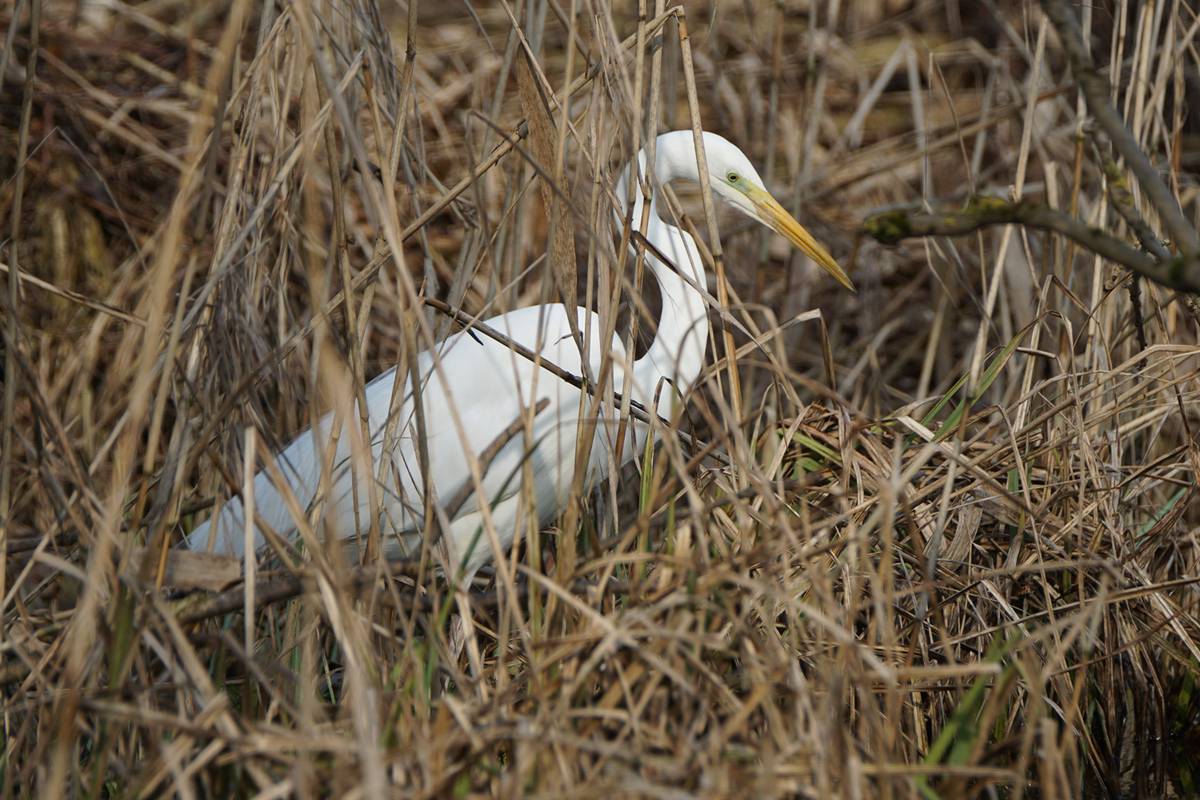 Bei Futtersuche im Winter wird auch der scheue Silberreiher unvorsichtig.