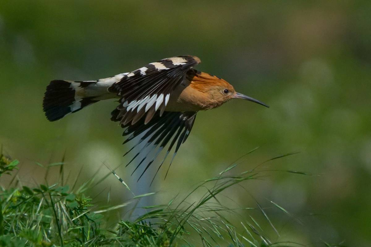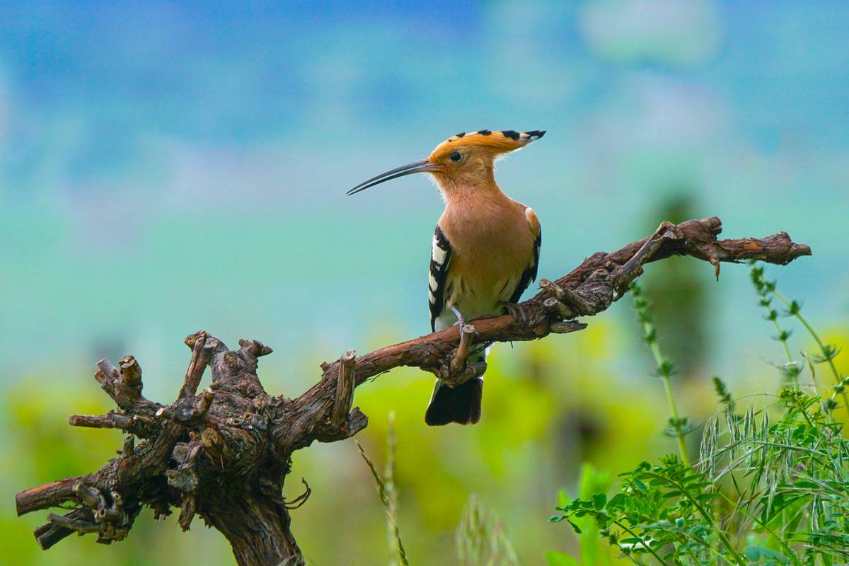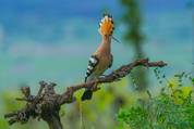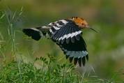 Der Wiedehopf ist ein exotisch aussehender Vogel. Er hat einen rosa-braunen Körper, auffällige schwarz-weiße Flügel, einen schwarzen, nach unten gebogenen Schnabel und einen rosa-braunen Kamm, den er bei Erregung aufstellt.