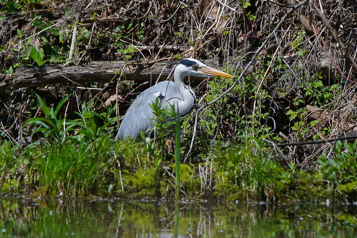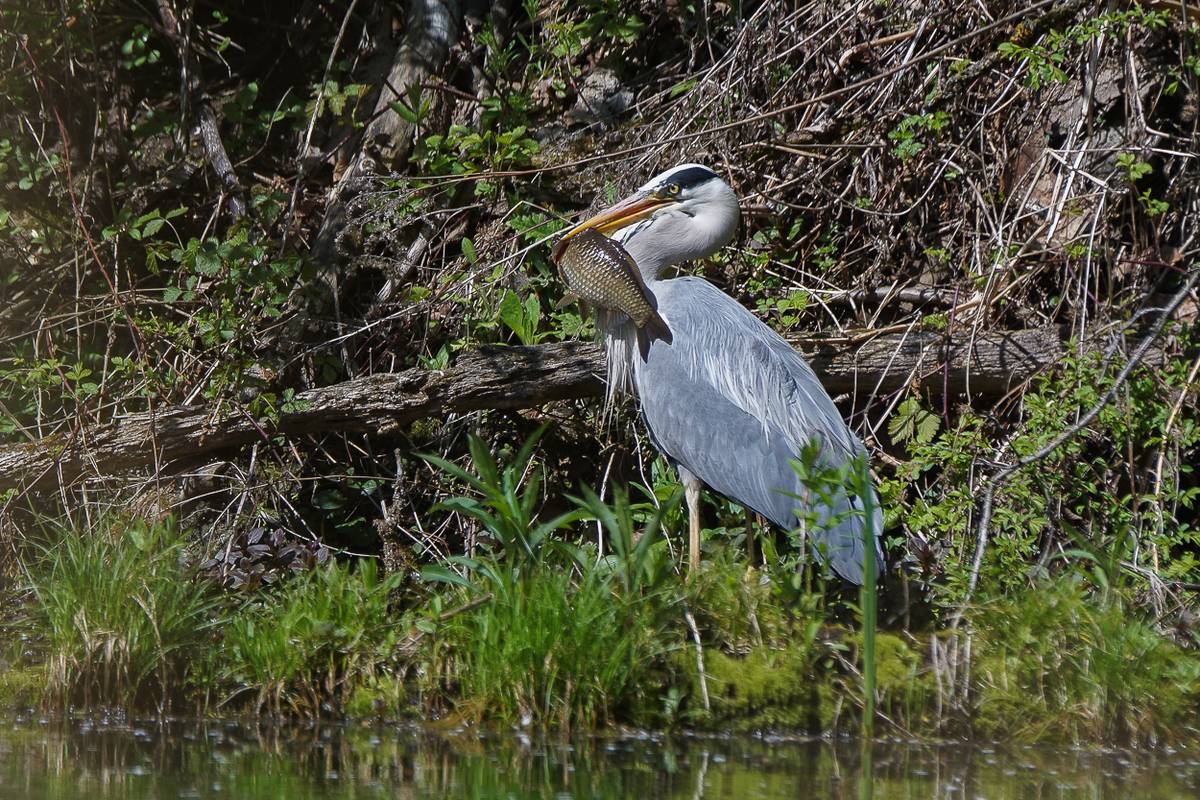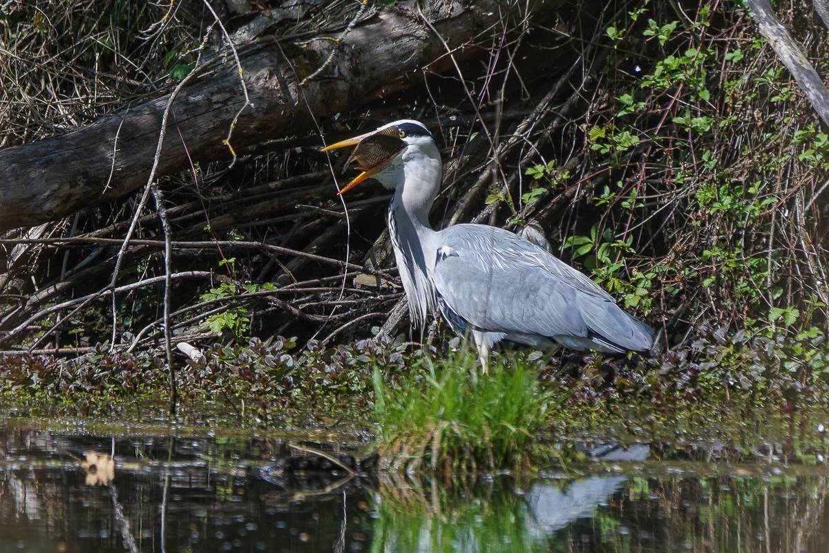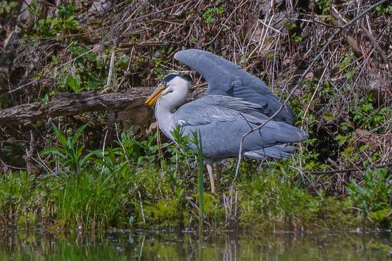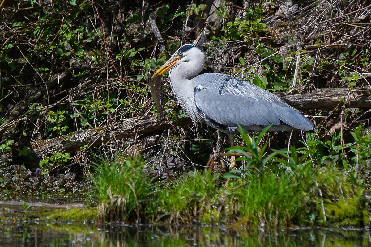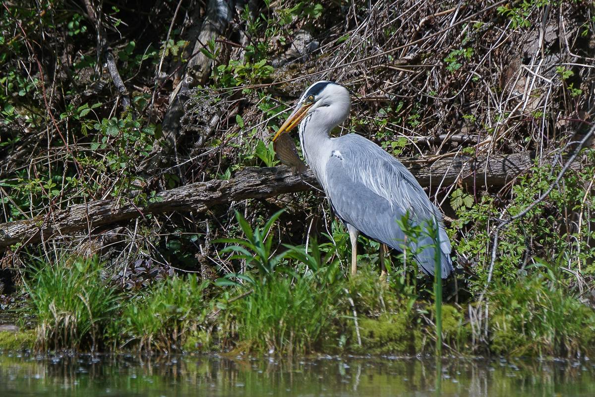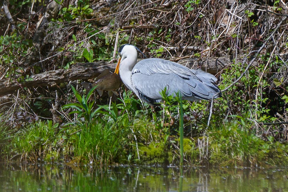 Der Graureiher - auch Fischreiher genannt, ist ein stattlicher Großvogel und ist unser zweitgrößter einheimischer Vogel nach dem Storch. Seinen Namen hat er von der Farbe seines Gefieders. Er kann ohne Mühe Fische von bis zu 30 cm Länge fressen.